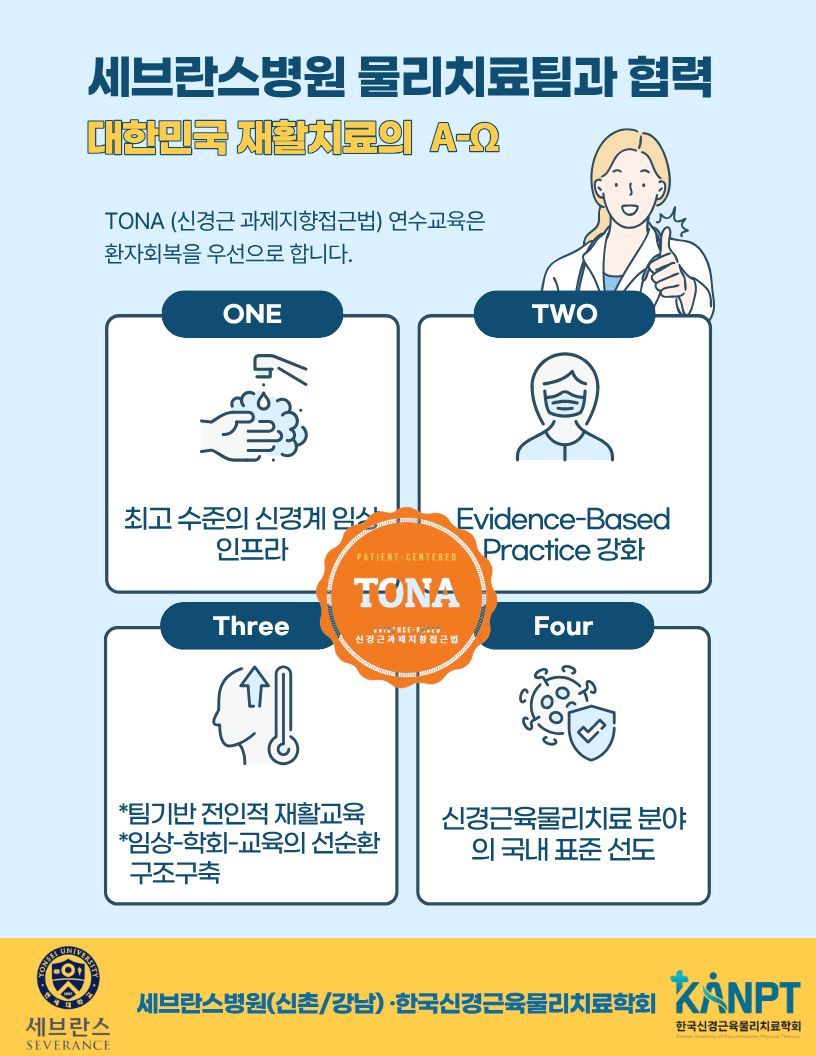 공지사항 학회소식 공지사항 세브란스병원(신촌, 강남) 물리치료팀과 재활치료 교육협력 관리자 / 2026-01-24 이전글 ▣ [서울/경기] 2026년 TONA 성인트랙_12기 연수교육 신청 및 입금 안내 다음글 다음글이 없습니다. 목록